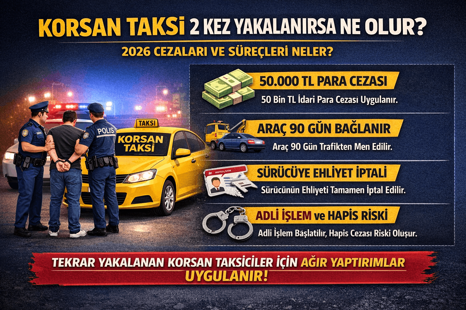 Korsan taksi faaliyetinin ikinci kez tespit edilmesi hem sürücü hem de araç sahibi açısından ciddi sonuçlar doğurur. 2026 yılı düzenlemeleriyle birlikte korsan taksi yakalanma cezası sadece maddi yaptırımlarla sınırlı kalmaz. İkinci yakalanmada uygulanan cezalar aracın daha uzun süre bağlanması ve sürücünün ticari faaliyetlerine kısıtlama getirilmesi gibi sonuçlar doğurabilir. Ayrıca tekrarlanan ihlaller ilerleyen süreçte adli yaptırımlara kadar uzanabilen bir tabloyu da beraberinde getirebilir.